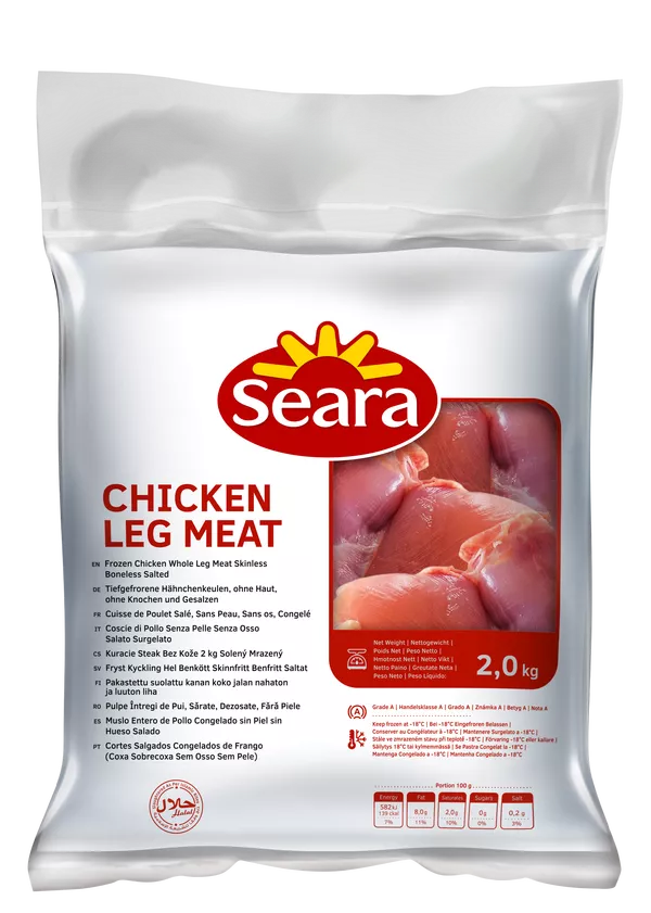 A whole chicken leg – skinless, boneless, and lightly salted – delivered direct to your freezer.